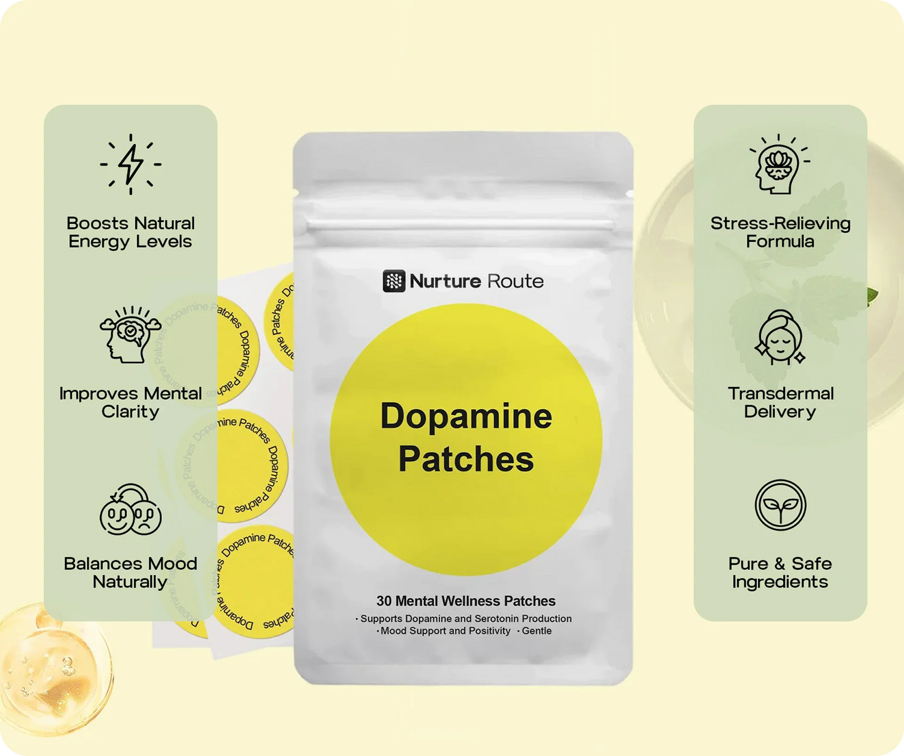 Nurture Route Dopamine Patches use transdermal delivery technology— meaning they release natural mood-supporting ingredients directly through your skin and into your bloodstream. This ensures a steady, all-day release without spikes or crashes like pills or caffeine.